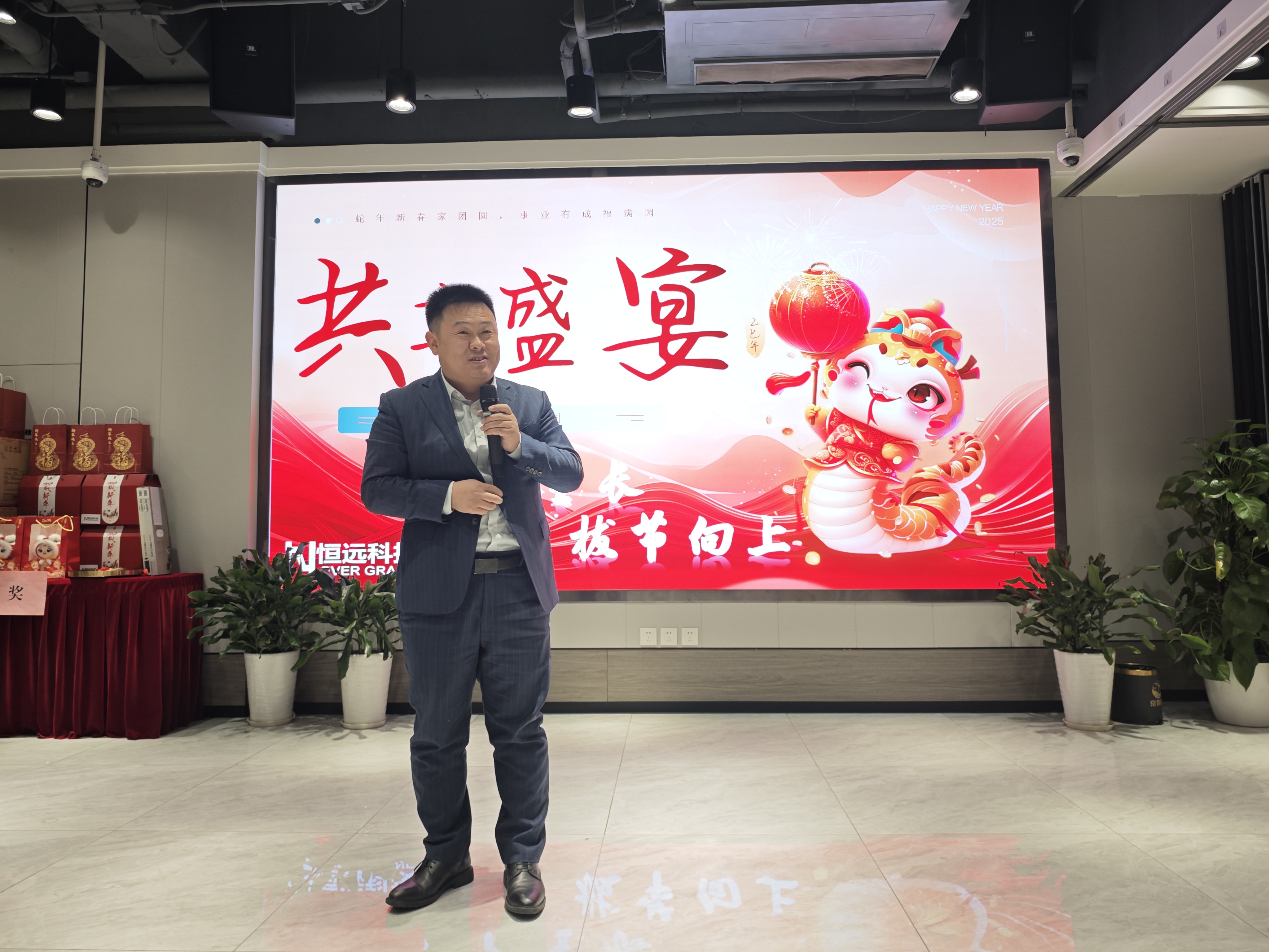 晚宴在恒遠科技董事長張永文的致辭中拉開序幕。他滿懷感慨地回顧了過去一年中,恒遠在復雜多變、競爭激烈的市場環境中,依然能夠穩健前行并取得輝煌成就的歷程,并向每一位為公司傾注心血、默默奉獻的員工表達了由衷的感激與敬意。張總強調,依托北京子公司這一戰略支點,恒遠科技不斷深化航天裝備領域的探索與研究,確保了軍工項目能夠高效、精準地實現本地化交付。