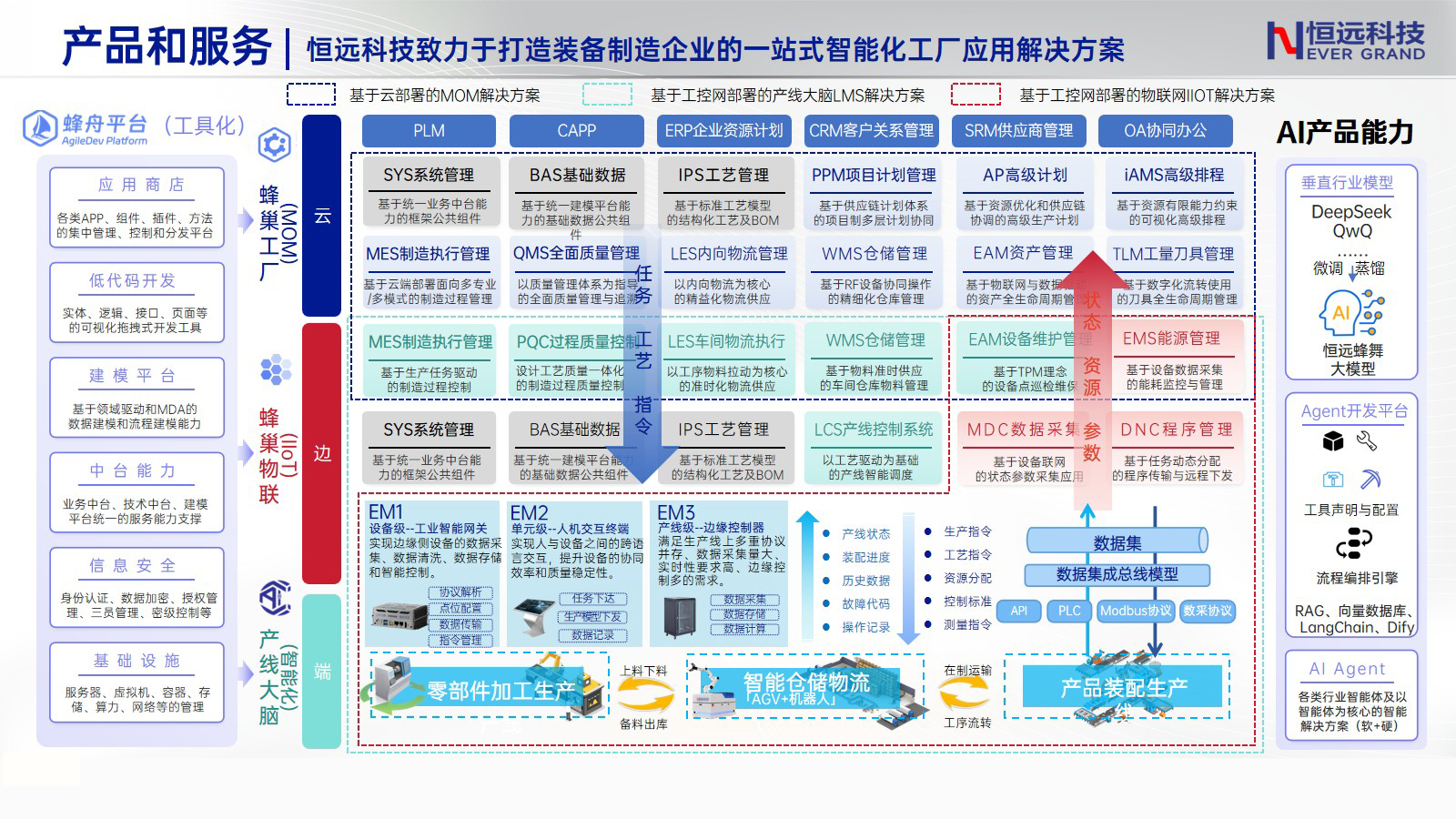 恒遠科技多年來始終扎根裝備制造領域,以“讓裝備制造更智能”為使命,構建覆蓋銷售訂單、計劃統籌、技術工藝、生產制造、質量管理到設備管理等核心環節的全流程數智化能力,并依托“產線大腦”“AI工作空間”等人工智能產品,打通從設備層到管理層的實時雙向數據通道,重點打造工藝優化、質量檢測等場景的Agent智能應用,推動業務模式從“流程驅動”向“數據驅動”的智能跨越。
