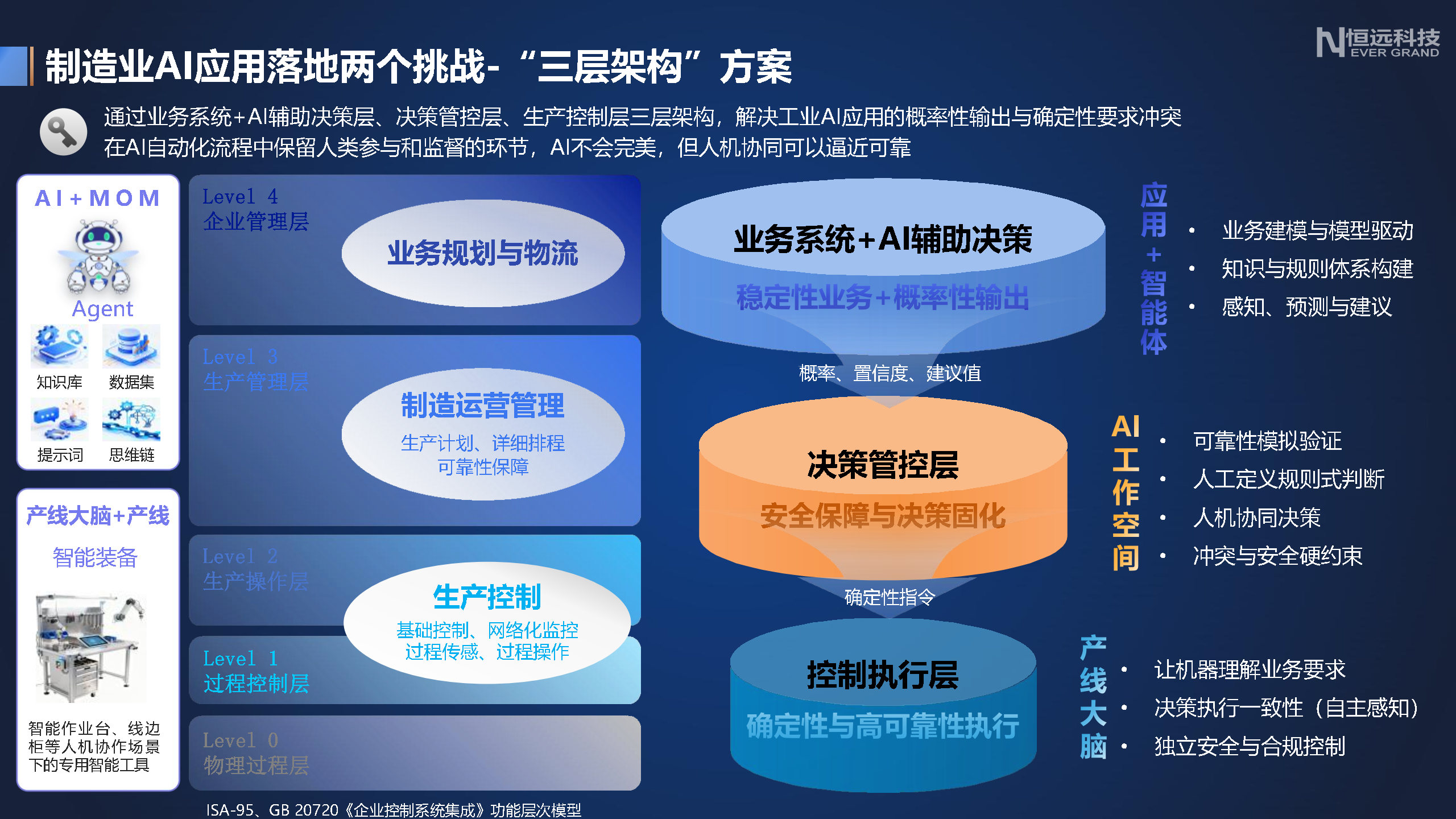 演講精準指出了工業AI落地的核心挑戰,即如何調和算法的概率性輸出與工業生產對確定性的高要求。對此,恒遠科技提出的“業務-決策-控制”三層協同架構,提供了一條破局之路。該架構在借助AI進行數據洞察和輔助決策的同時,通過堅實的中間層進行可靠性驗證與人機協同,確保最終指令的精準與安全,為AI在排產、工藝、質量等核心環節的深度應用提供了穩定基石,指明了從單點智能到整體優化的演進方向。